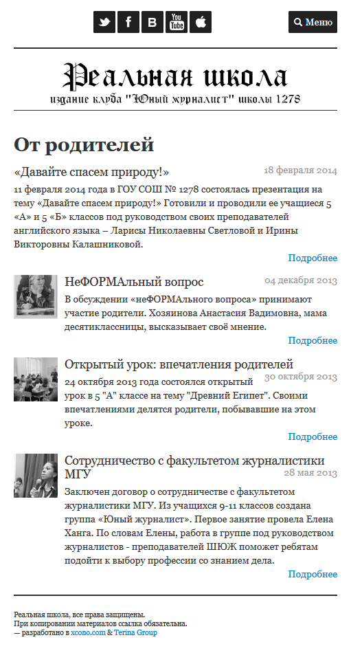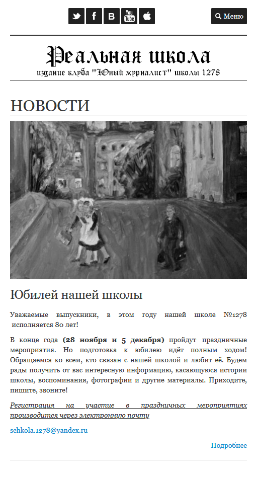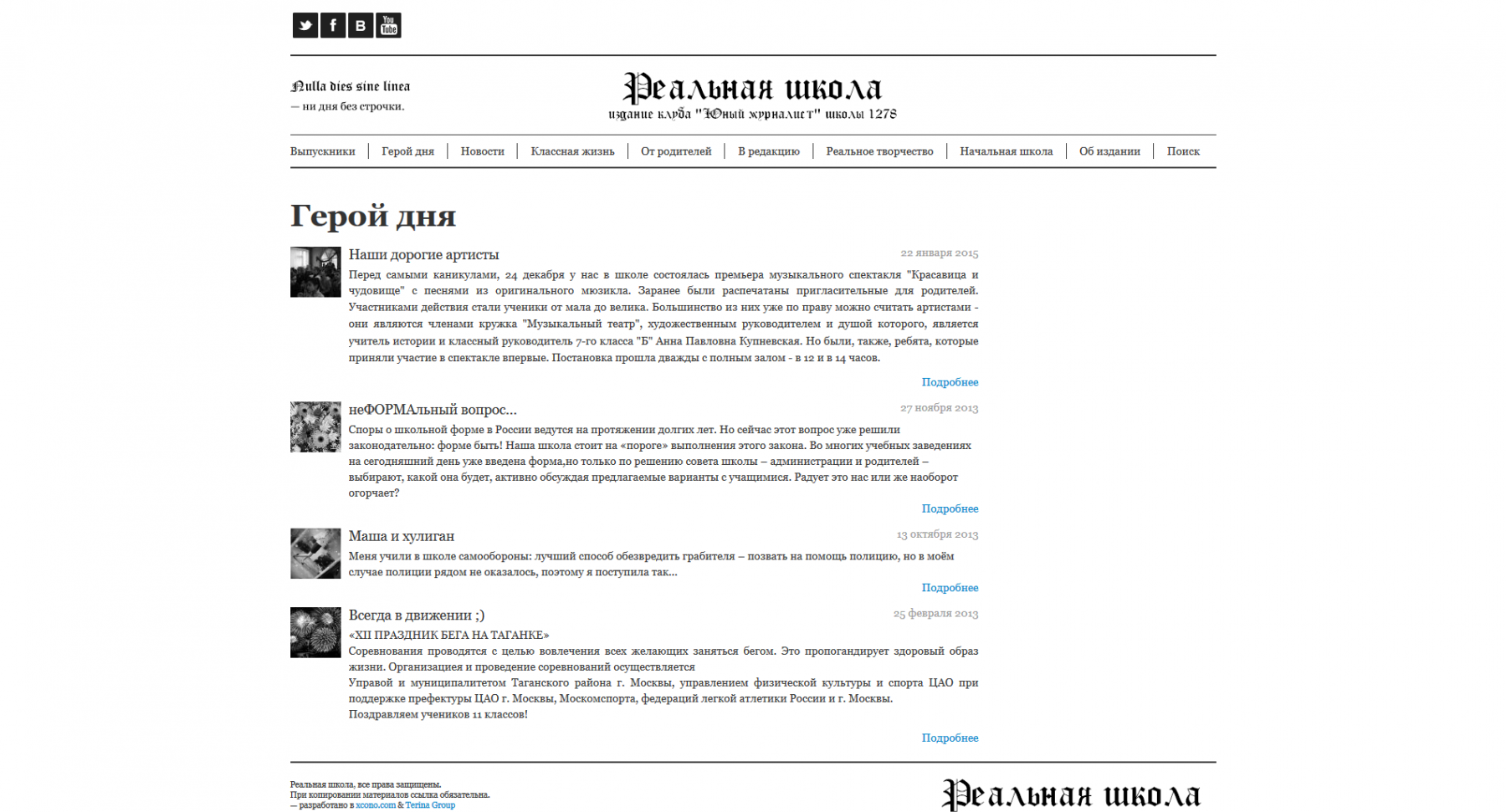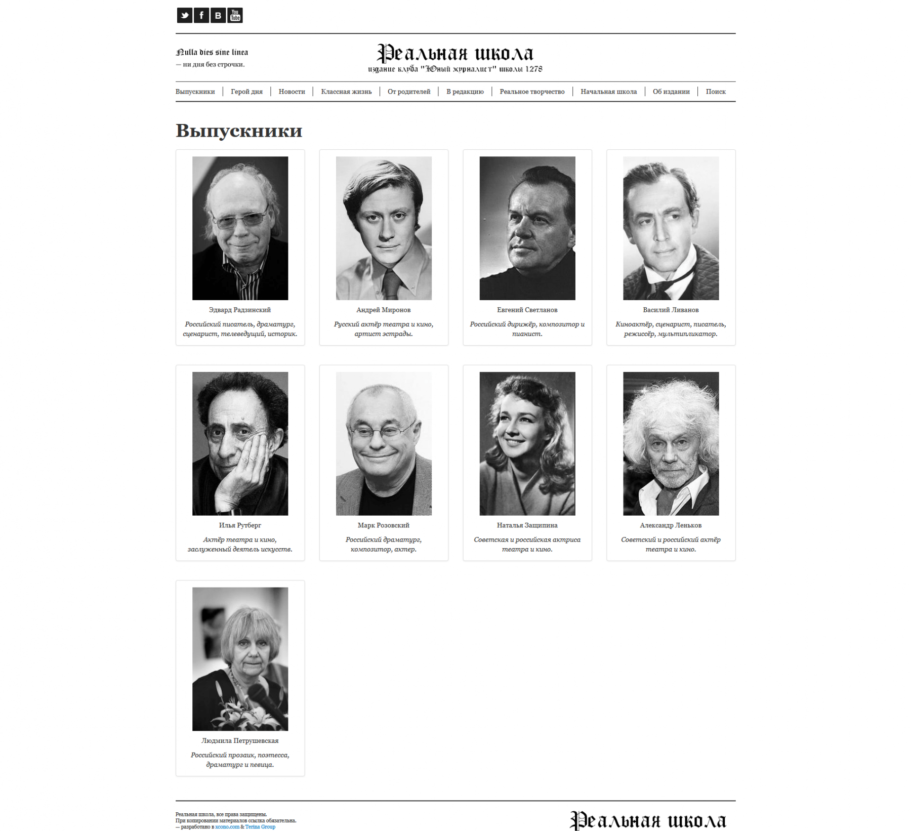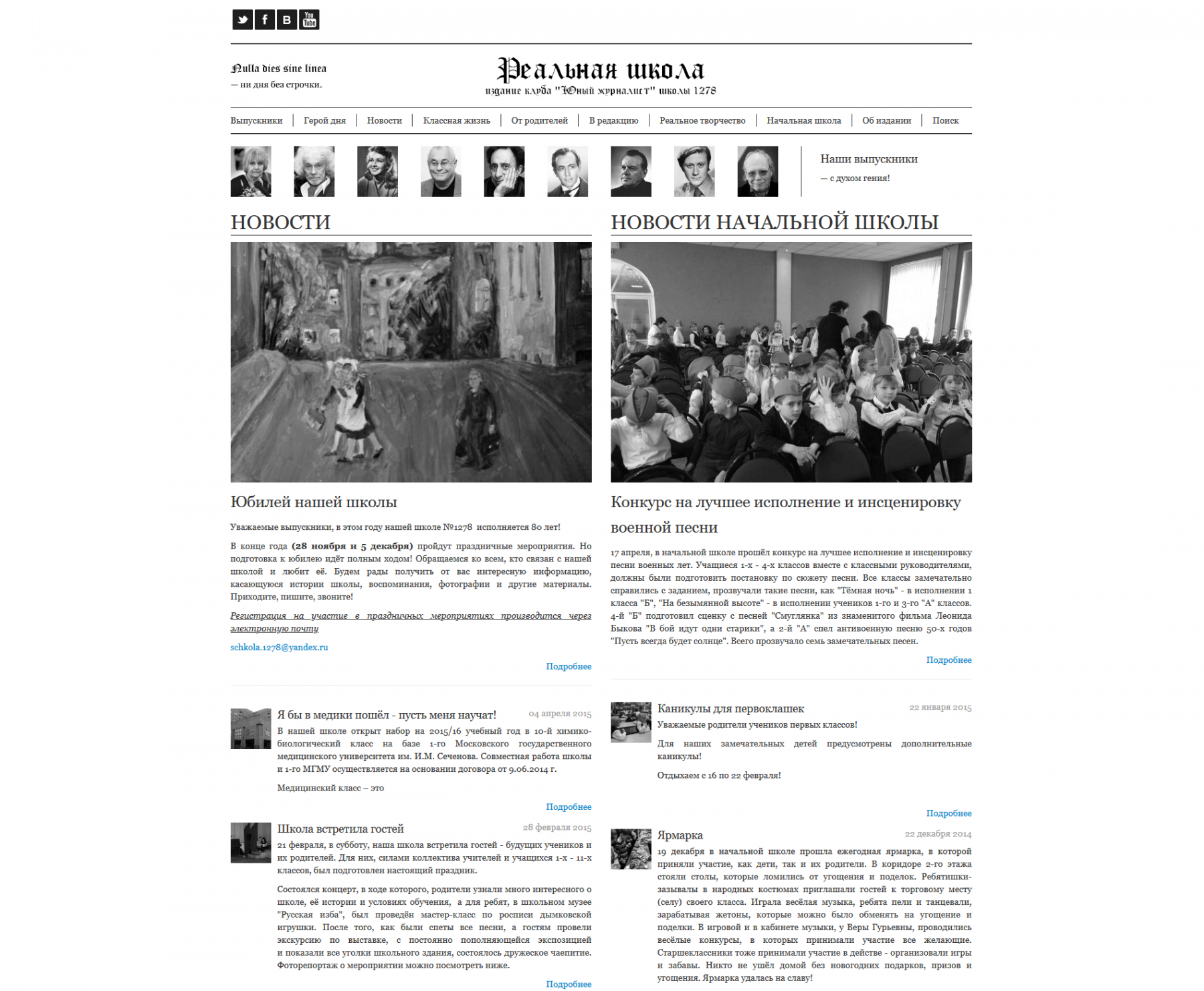 Интернет-портал одной из самых известных школ Москвы. Школе 1278 более 70 лет, и в её стенах учились такие знаменитости как Андрей Миронов, Эдвард Радзинский, Марк Розовский, Александр Леньков, Илья Рутберг.