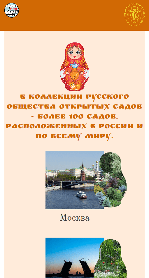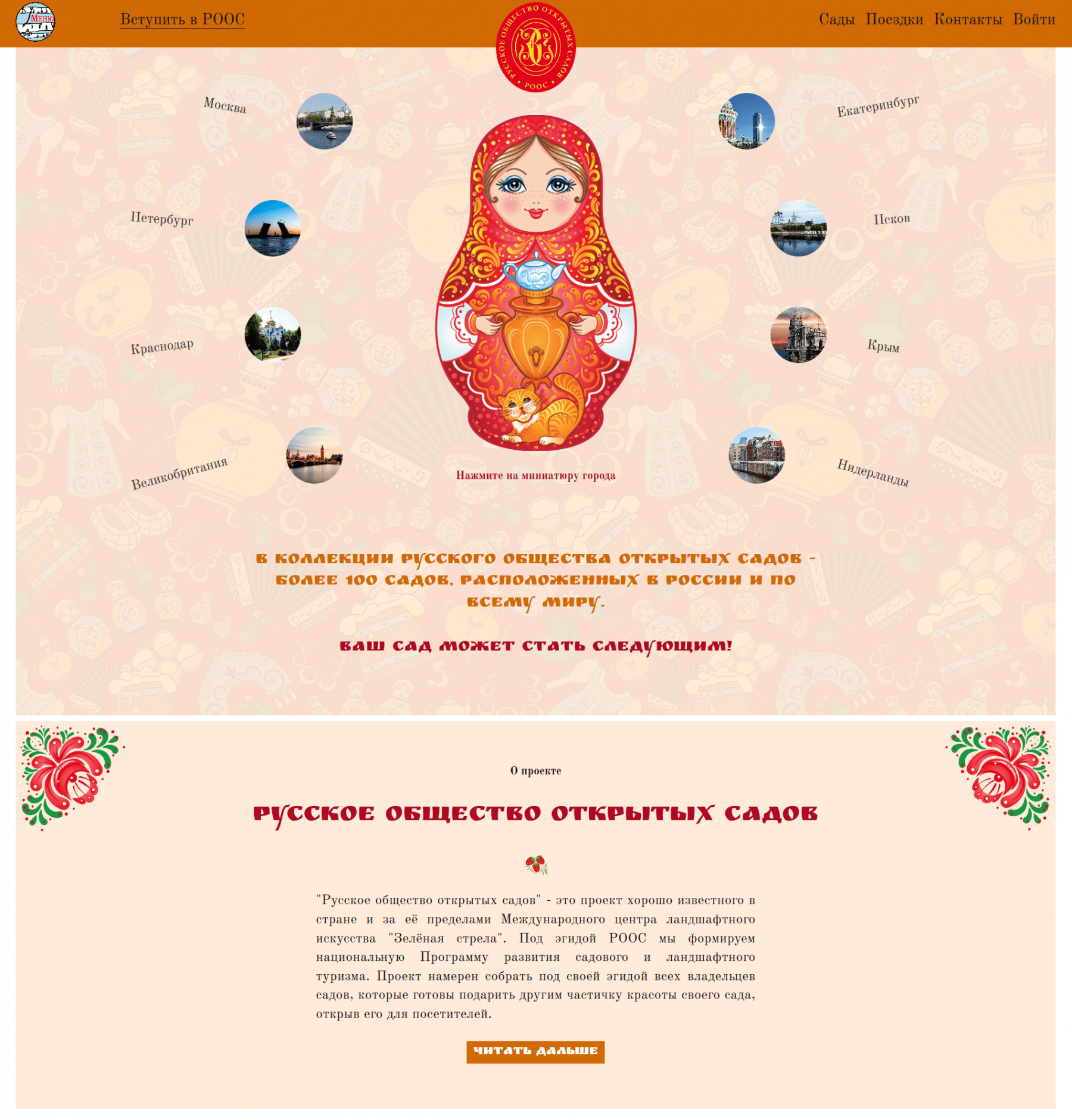 А потому в качестве объединяющего мотива были выбраны традиционно русские образы. В главной роли оказалась, конечно же, столь известная во всём мире красавица-матрёшка, а во всём дизайне сайта использованы элементы русских народных орнаментов. Заняв почётное место на главной странице сайта, Матрёшка при нажатии на название города символично превращается в один из расположенных там садов - членов Русского Общества Открытых Садов.