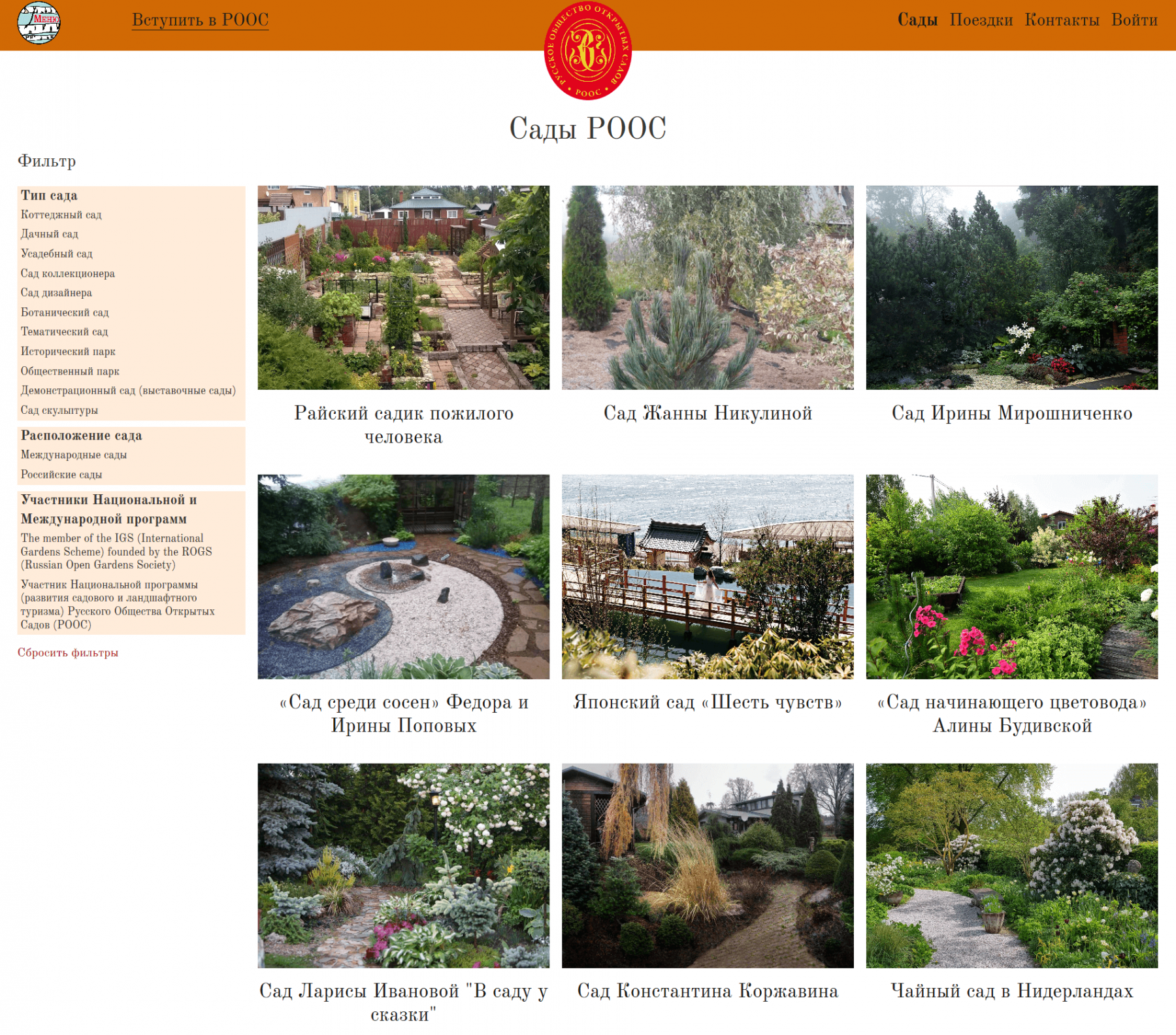 Уже сейчас садов в РООС - много. А подразумевается, что со временем их будет бесконечно много. Это означает, что посетителю сайта надо помочь сориентироваться во всём этом многообразии. Поэтому для раздела "Сады" создан удобный классификатор, который позволяет отфильтровать сады по типу, расположению, а также тому, является ли сад членом Национальной либо Международной программы развития садового туризма.