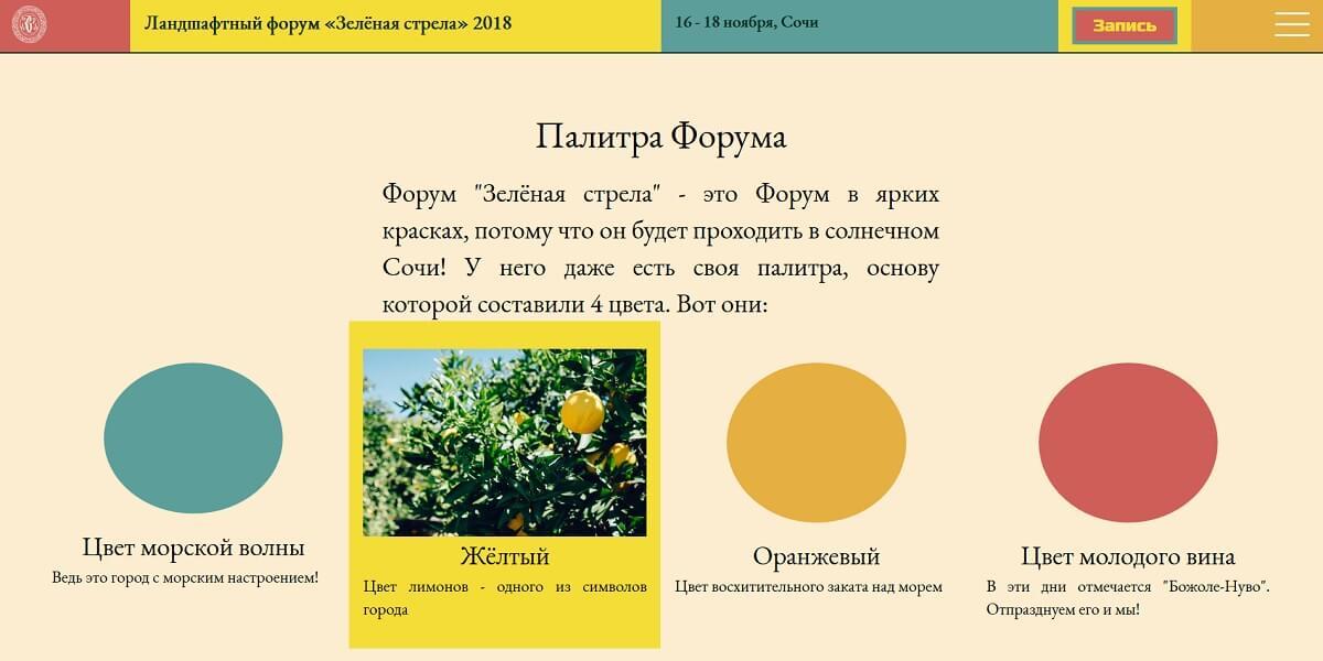 Решение: Форум 2018 года проводился в Сочи - городе моря, солнца и ярких красок. Кроме того, слоган Форума - «Самое яркое событие осени». А потому в основу дизайн-концепции были положены основные цвета туристической столицы России и самого мероприятия: цвет морской волны, цвет молодого вина, цвет заката над морем и цвет лимона - одного из популярных растений региона. Яркая тема выражена не только в оформлении, но и в описательной части: значение красок объясняются в одном из блоков страницы, а при наведении можно видеть олицетворение цвета.
