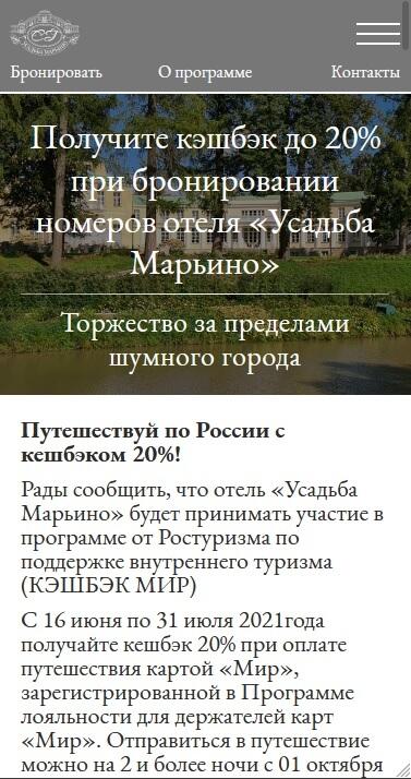 Разработка лэндинга для участия отеля «Усадьба Марьино» в программе от Ростуризма по поддержке внутреннего туризма (КЭШБЭК МИР).