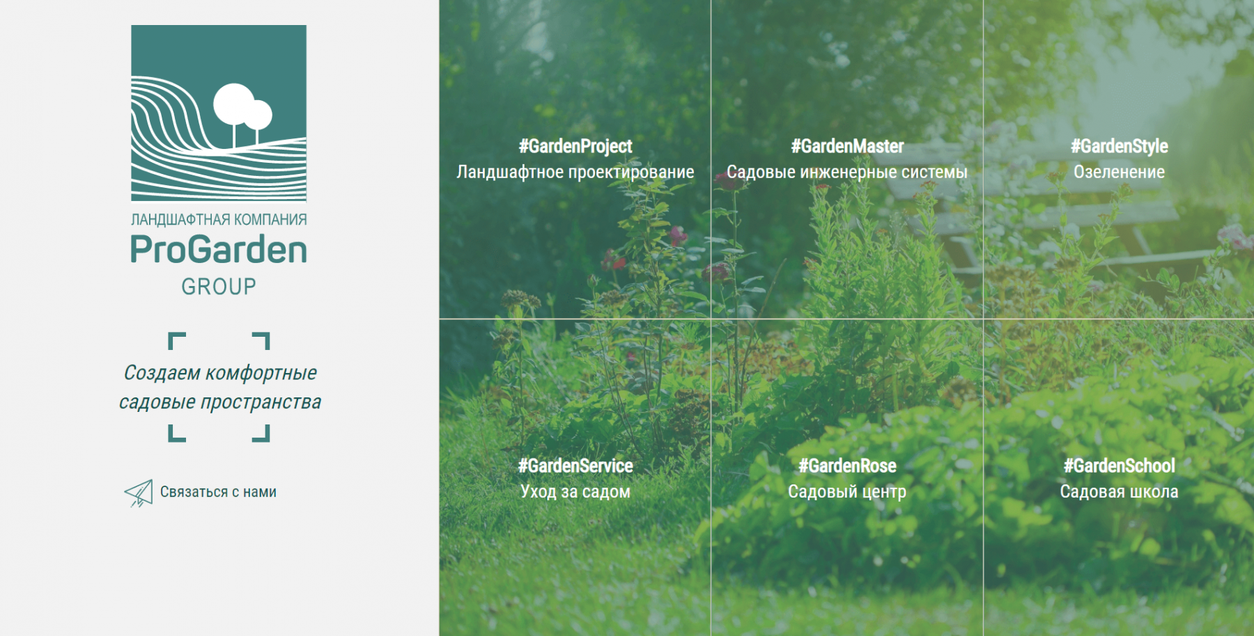 ProGarden Group - крупнейшая ландшафтная компания в Ярославской области и одна из самых известных в России. В компании - несколько развитых направлений, таких как садовый центр, ландшафтное бюро, готовые решения, образовательные программы. А потому основной задачей было объединить их в единое целое, в то же время подчеркнув уникальность каждого из них.