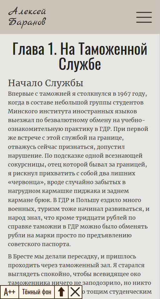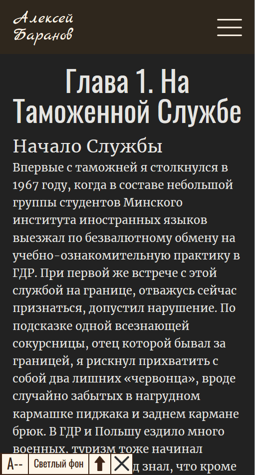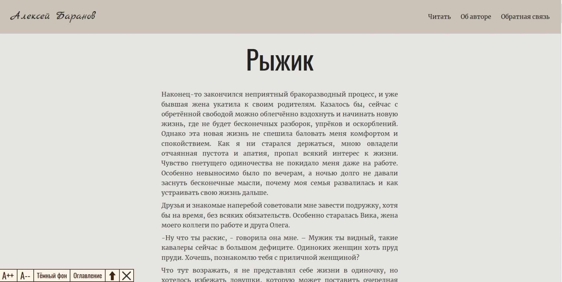 Особое внимание мы уделили удобству чтения. Для этого страница каждого рассказа построена как страница электронной книги. Читатель может из любого места вызвать оглавление и сразу перейти на страницу другого рассказа. Кроме того создана панель управления внешним видом текста. Пользователь может увеличить шрифт и поменять контрастность, ведь часто светлые буквы на тёмном фоне нам читать удобнее. Светлый фон специально сделан не белым: согласно разным исследованиям, глаза меньше устают, когда мы читаем текст не на чисто-белой странице, а на странице со светлым тёплым фоном.